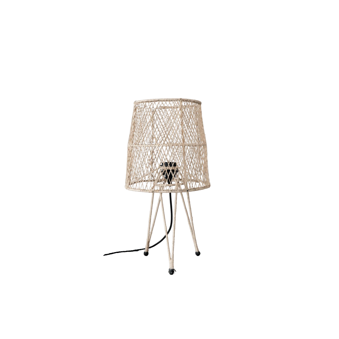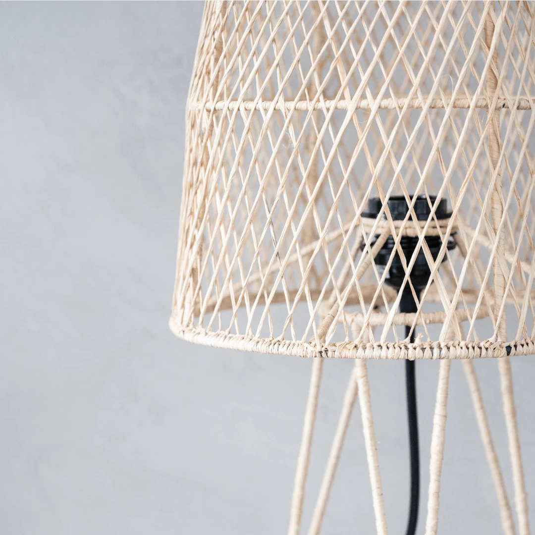 This handmade lamp from woven bast around an iron tripod structure inspired by boho decor.