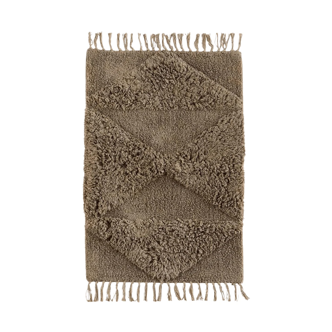 A gorgeous high quality cotton bathmat with a subtle pattern embedded in the pile and tassels on either end.