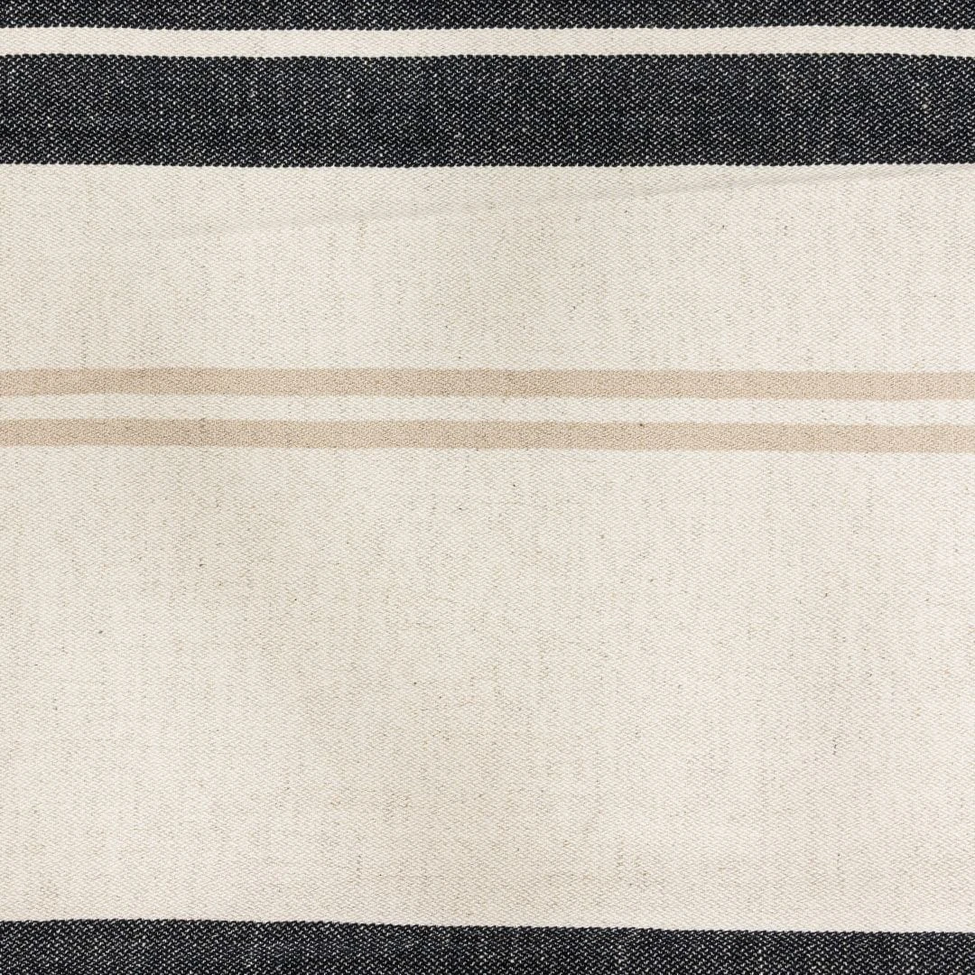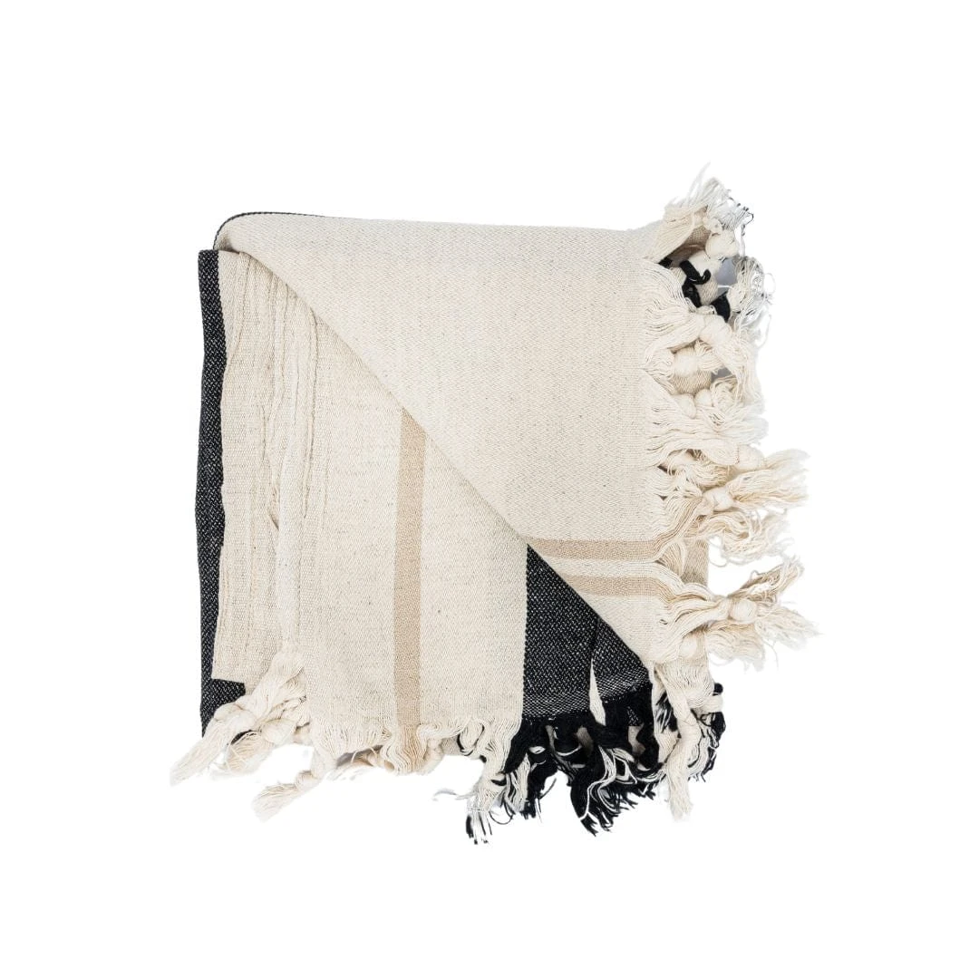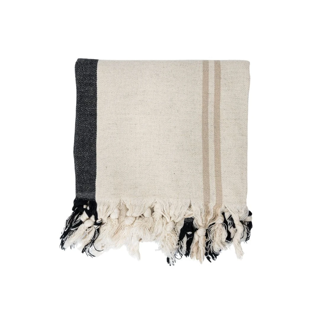An indispensable home accessory: this Fouta towel with black, white and sand coloured stripes.
