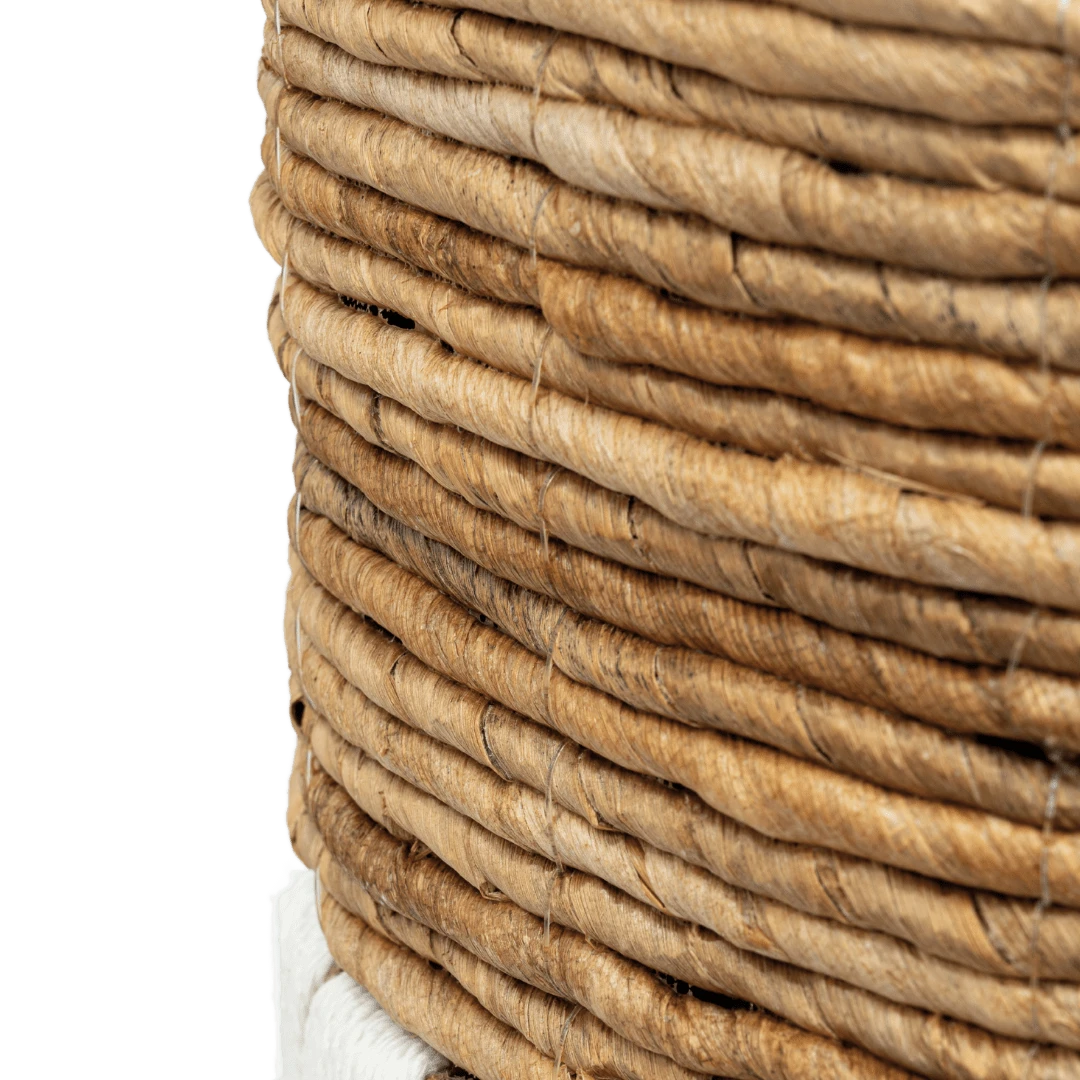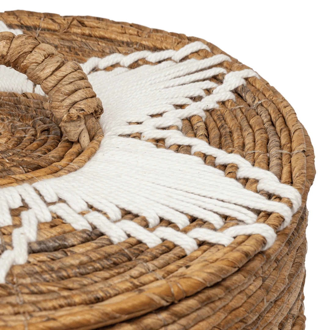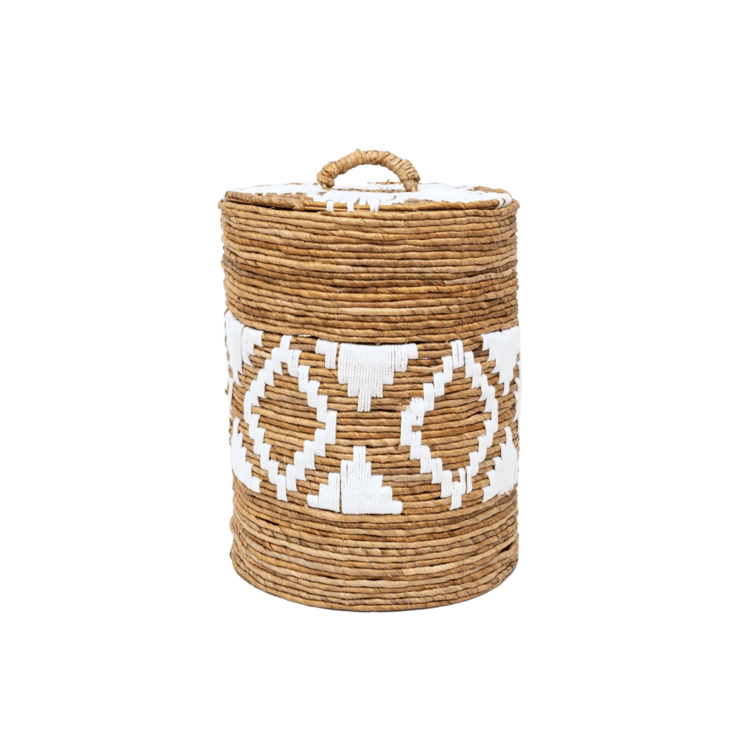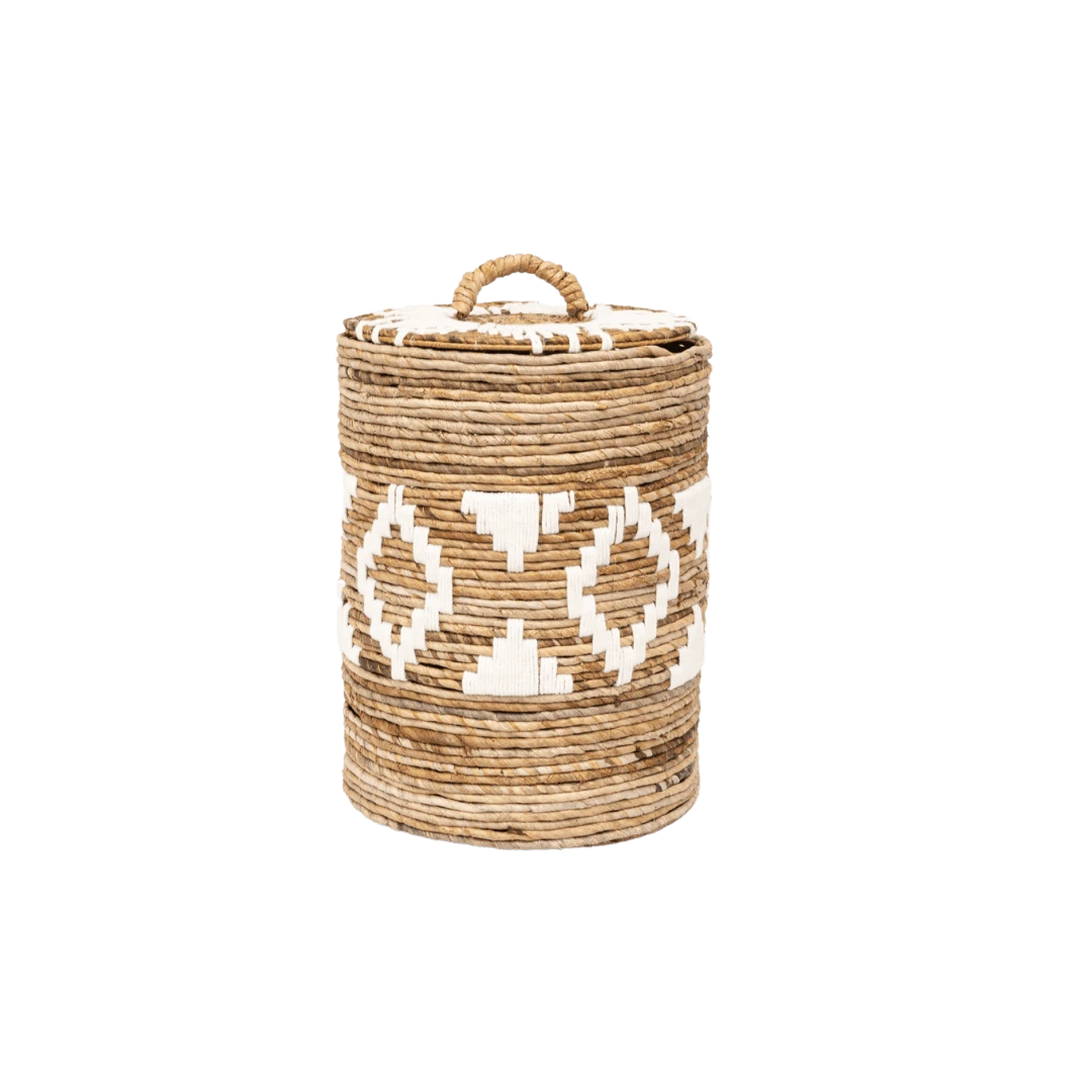 These baskets are carefully handwoven using banana leaf and cotton rope, with a distinct star motif on the lid and an ethnic pattern on the sides. Available in two sizes.