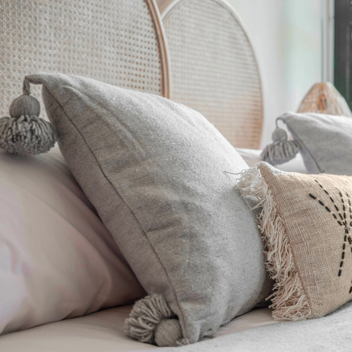 Stylish home decorating textile to add a touch of softness and ethnic style to your home PomPom cushions texture is warm and having natural chic vibe. These beautiful cotton cushion covers are hand woven in traditional style by artisans in Morocco.