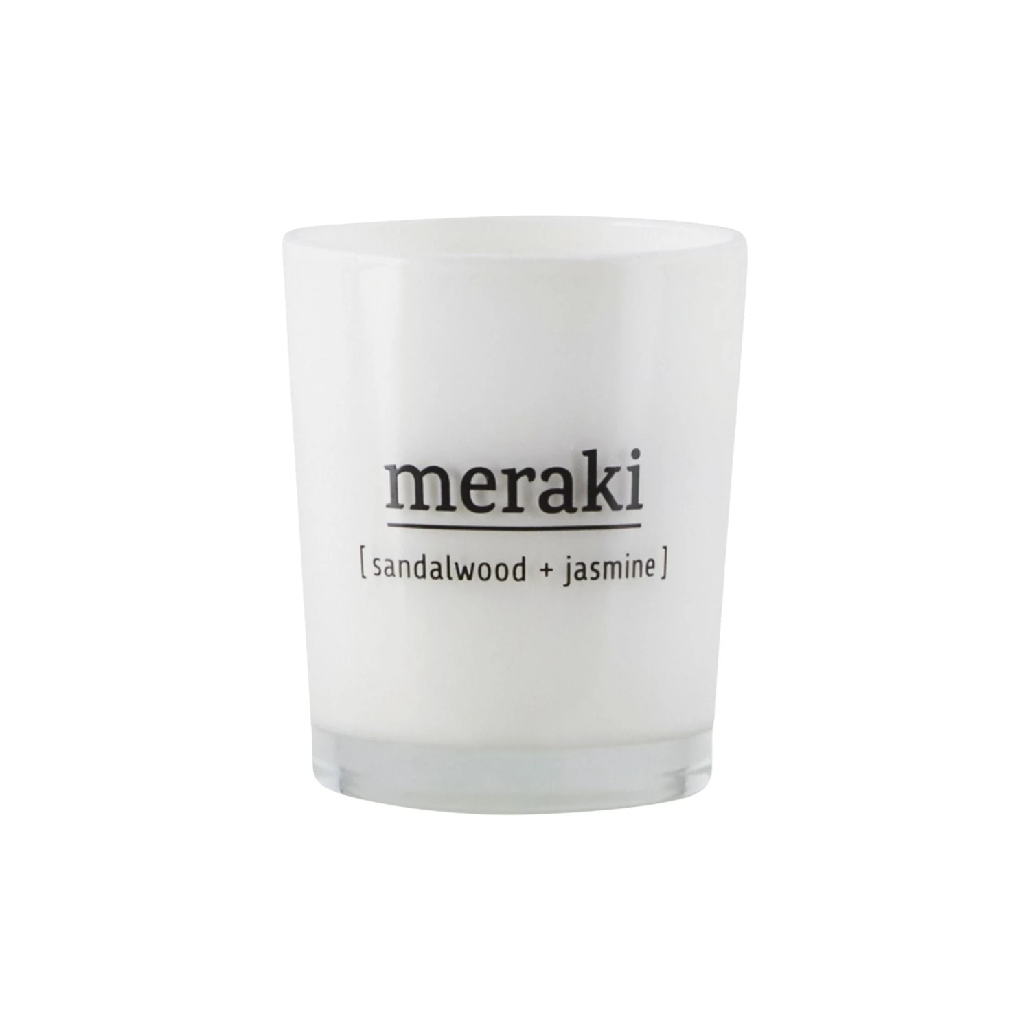 The scented candle smells like Sandalwood & Jasmine with a refreshing aroma.