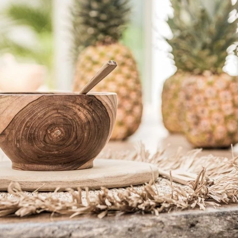 Handmade from natural Teak wood and sanded for a smooth finish. It is a practical tableware essential to any home that brings a unique charm to your table setting.